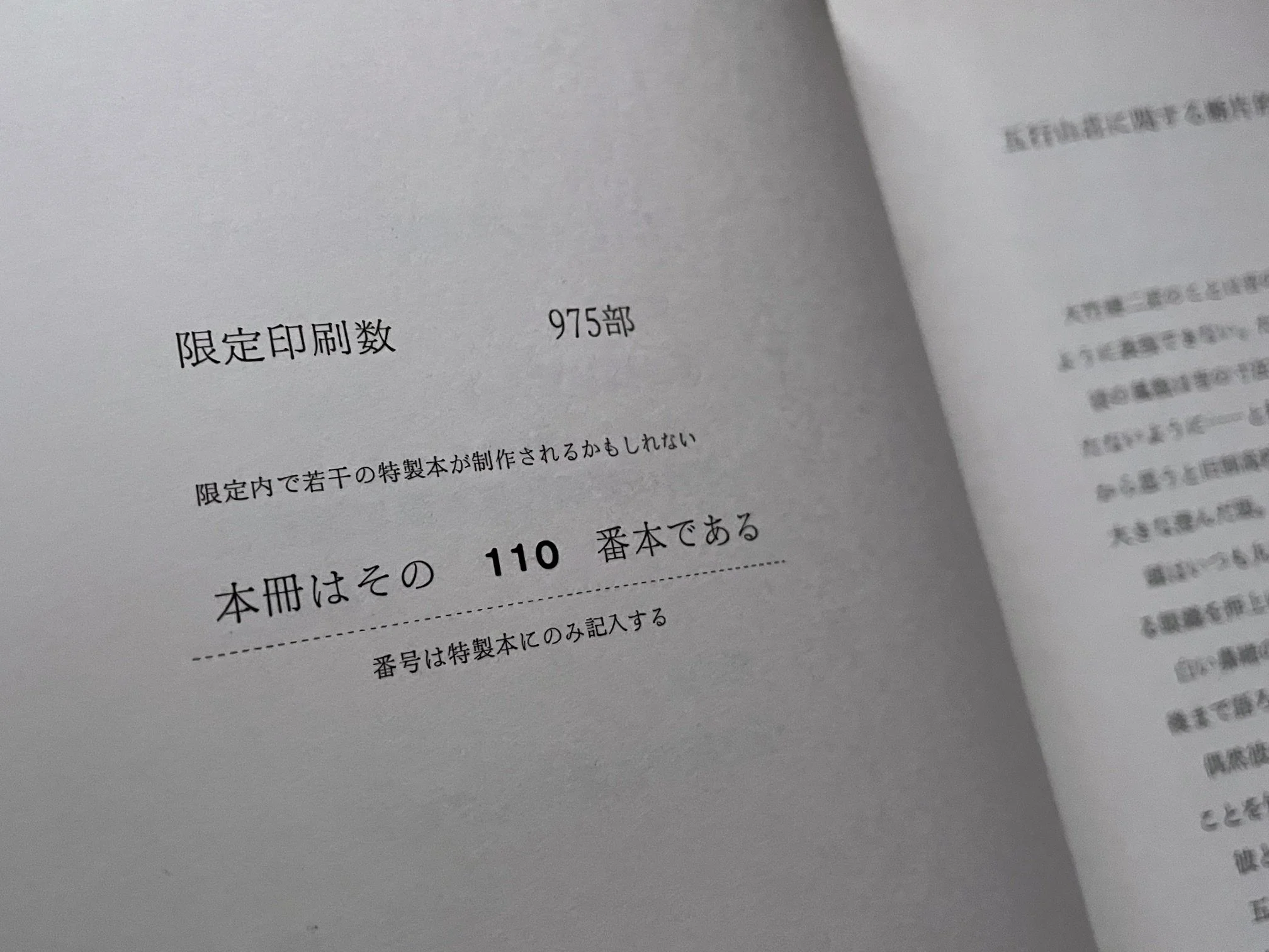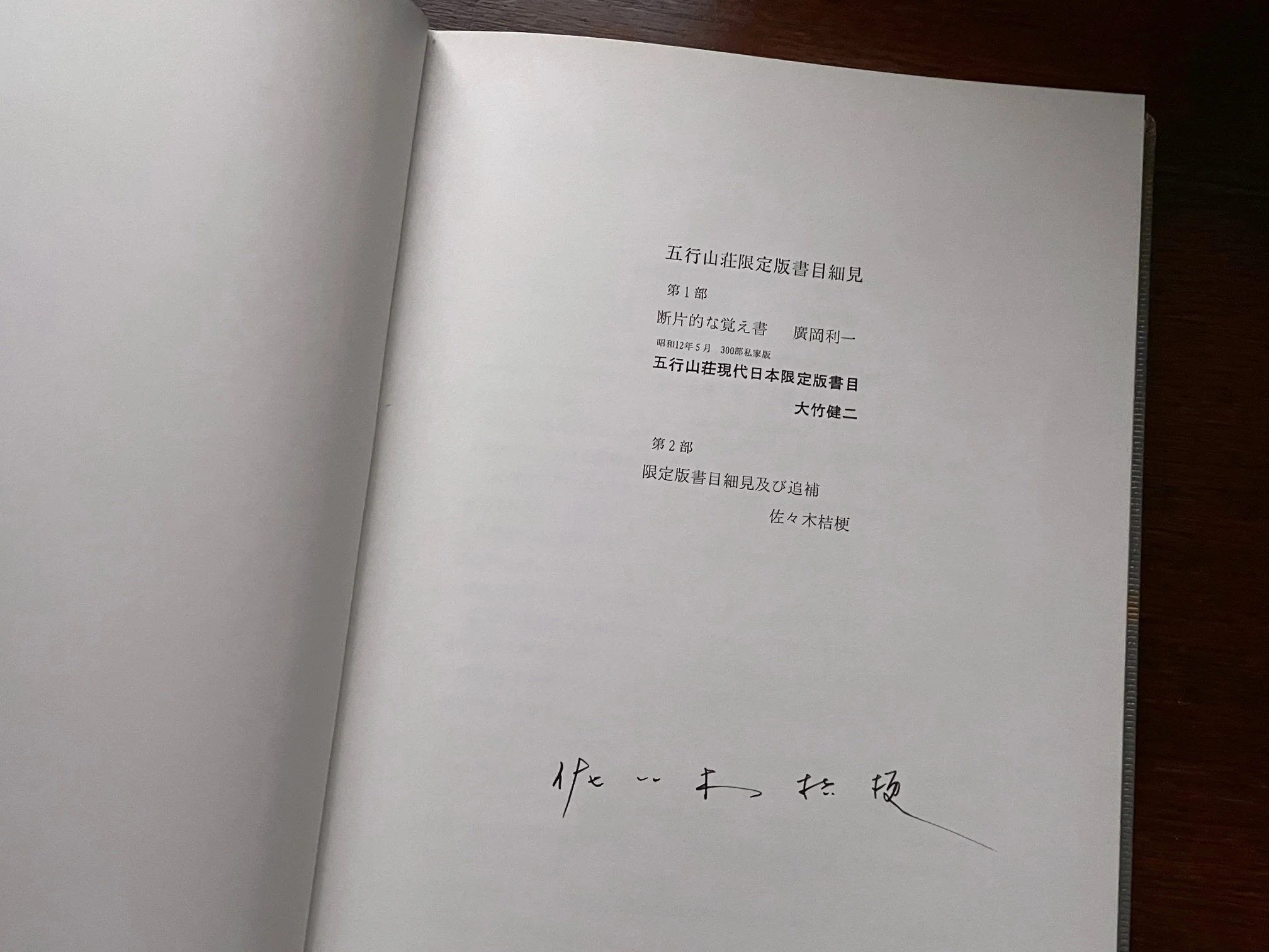 背マウントが美しい限定本らしい「天金」美しい小さな活字の箔押し鉄道マニアの佐々木桔梗氏の蔵書票が貼ってある見返し目次に編著者、刊行者佐々木氏のサイン大阪の古書店主廣岡利一氏による大竹健二氏の「五行山荘」についての貴重な証言大竹氏によるこだわりの内容の序で始まる独特の符号で書物の大きさを表すアイウエオ順に並んだ限定本目録赤で刷られて追加された大竹健二氏の略歴と重要な情報後半は佐々木桔梗氏による限定版目録で前半の補遺となる佐々木氏のあとがきは、戦前の一古書愛好家へのオマージュ奥付、プレスビブリオマーヌの書物は特別な和紙に一流の印刷、製本で仕上げられている私は戦前に出された『五行山荘限定版細見』の実物を見たことが無い。不思議な事に本文にも書影が無く、どのような装本であったのか気になる。