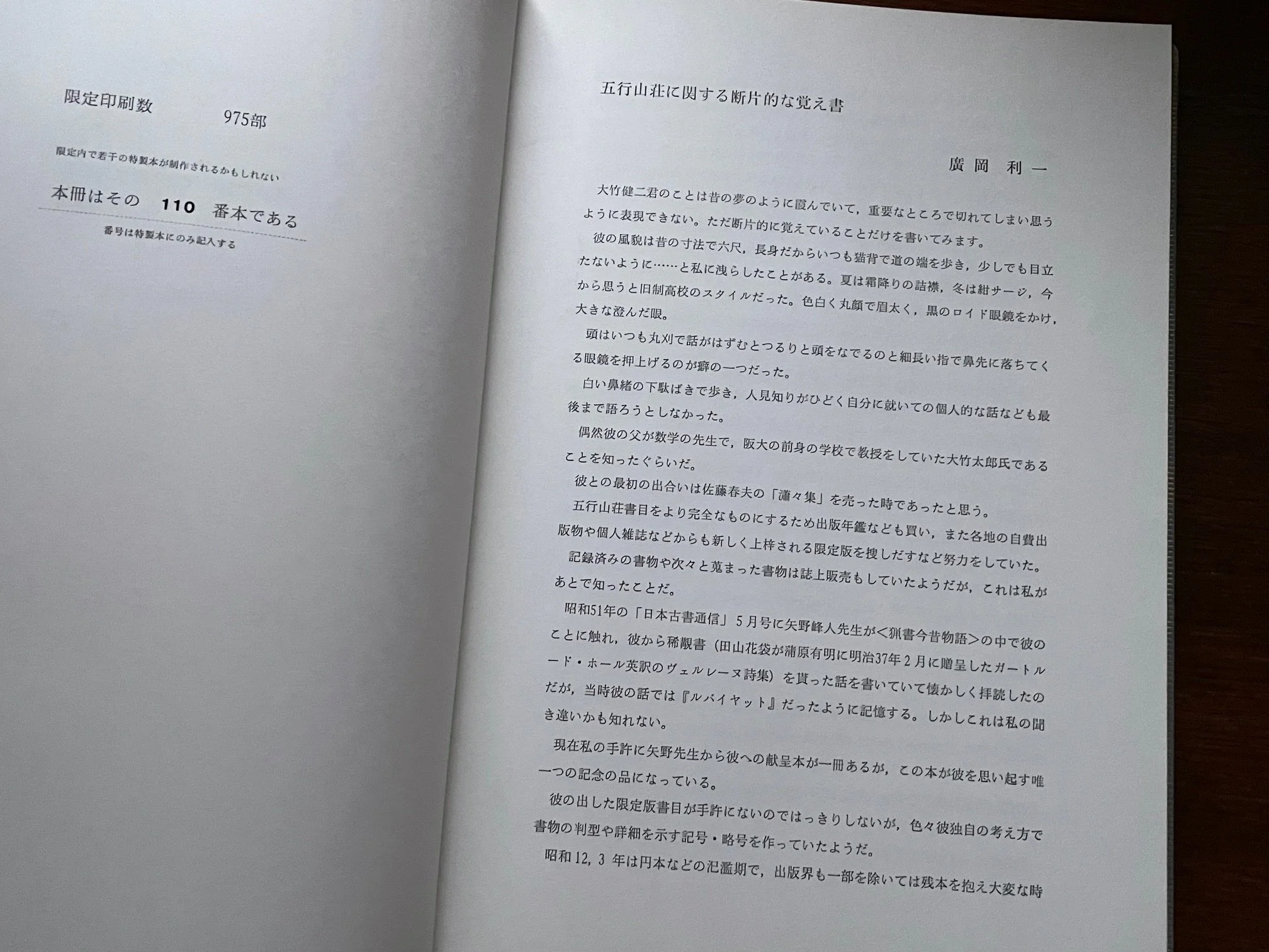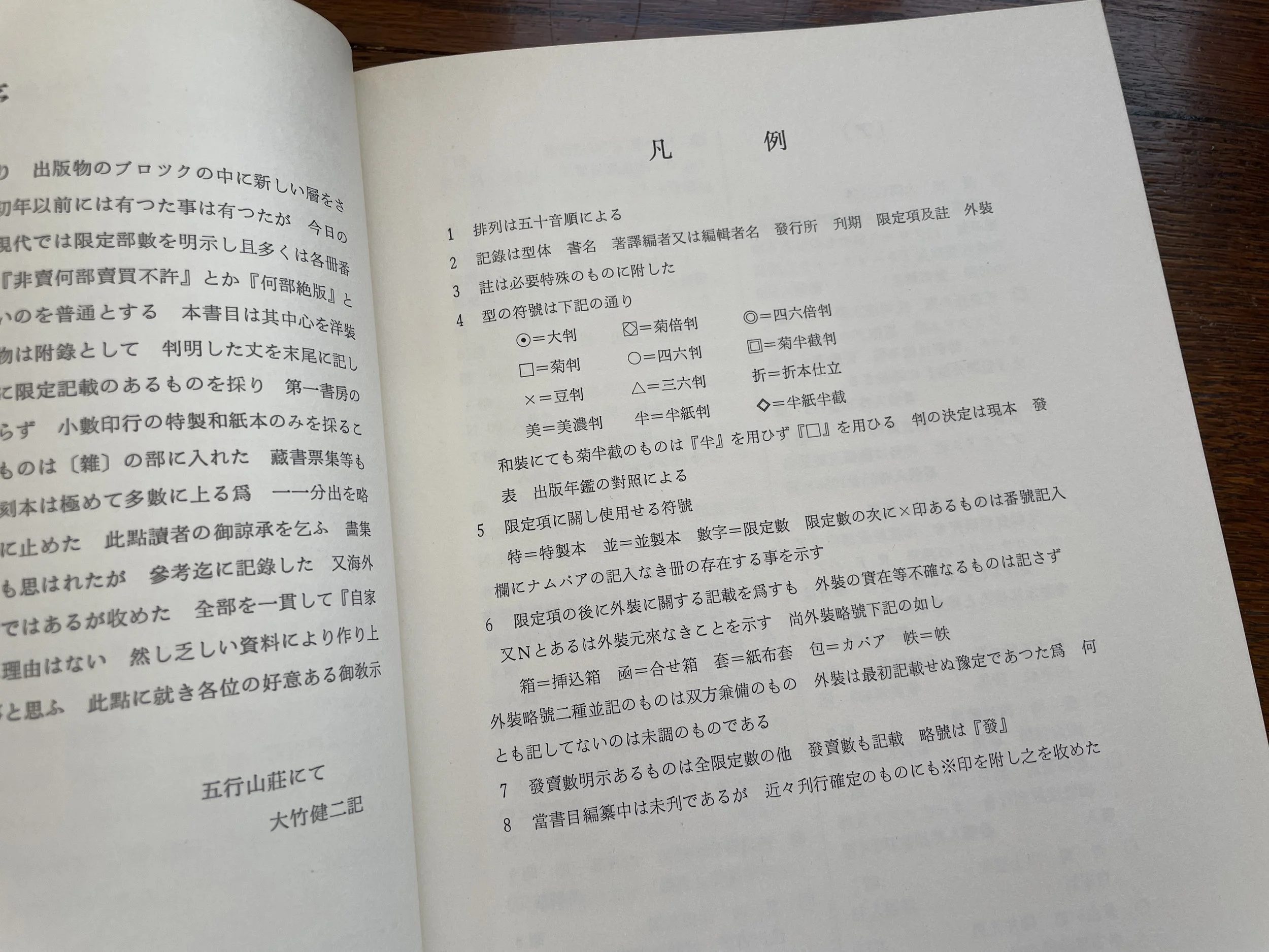 昭和十一年頃、神戸市西郊垂水の街で「五行山荘」と号して限定本を蒐集していた大竹健二(大正五年〜昭和十八年)と言う人物が居た。彼は地方都市在住ながら血まなこで限定本に関するさまざまな情報を集め、当時出版された限定本をコレクションし限定本目録を作られた。
