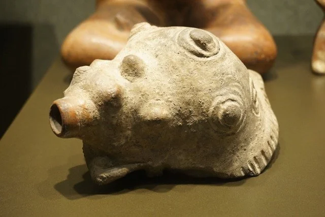 ▶︎粘土製三重フルート……グアテマラ出土のものを例外として、このような複合フルートはほとんどメキシコ湾岸地域とテオテワカンで発見されている。三重の管は一本が旋律、他の二本がドローン管として機能していたとされている。歌口が裏側にあるダクト・フルートで、吹口はそれぞれの管につながっているが、一つにまとめられているために三本同時に吹くことができる。